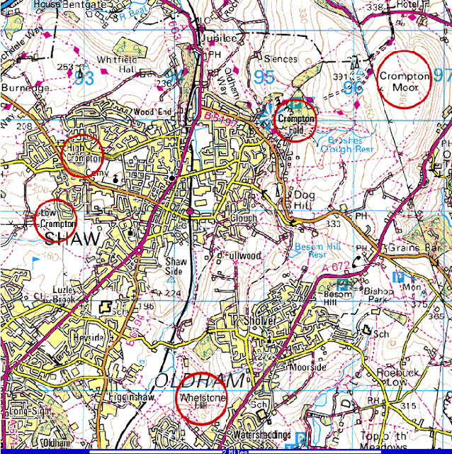 The township of Crompton (midway between Oldham and Rochdale) has an extreme length of about 3 miles from east to west, with a breadth of a 1½ miles. The River Beal runs northward through a central valley; to the east the ground, broken by one or two cloughs, rises continually until 1,300ft. (398m) is attained on Crompton Moor on the border of Yorkshire; while on the west the highest points near High Crompton and Whitfield, which are separated by a valley, rise to 700 and 825ft (220m); from them the surface slopes away in all directions, but most rapidly to the north. The Irk rises on the boundary between Crompton and Royton. The area is 2 864 acres.